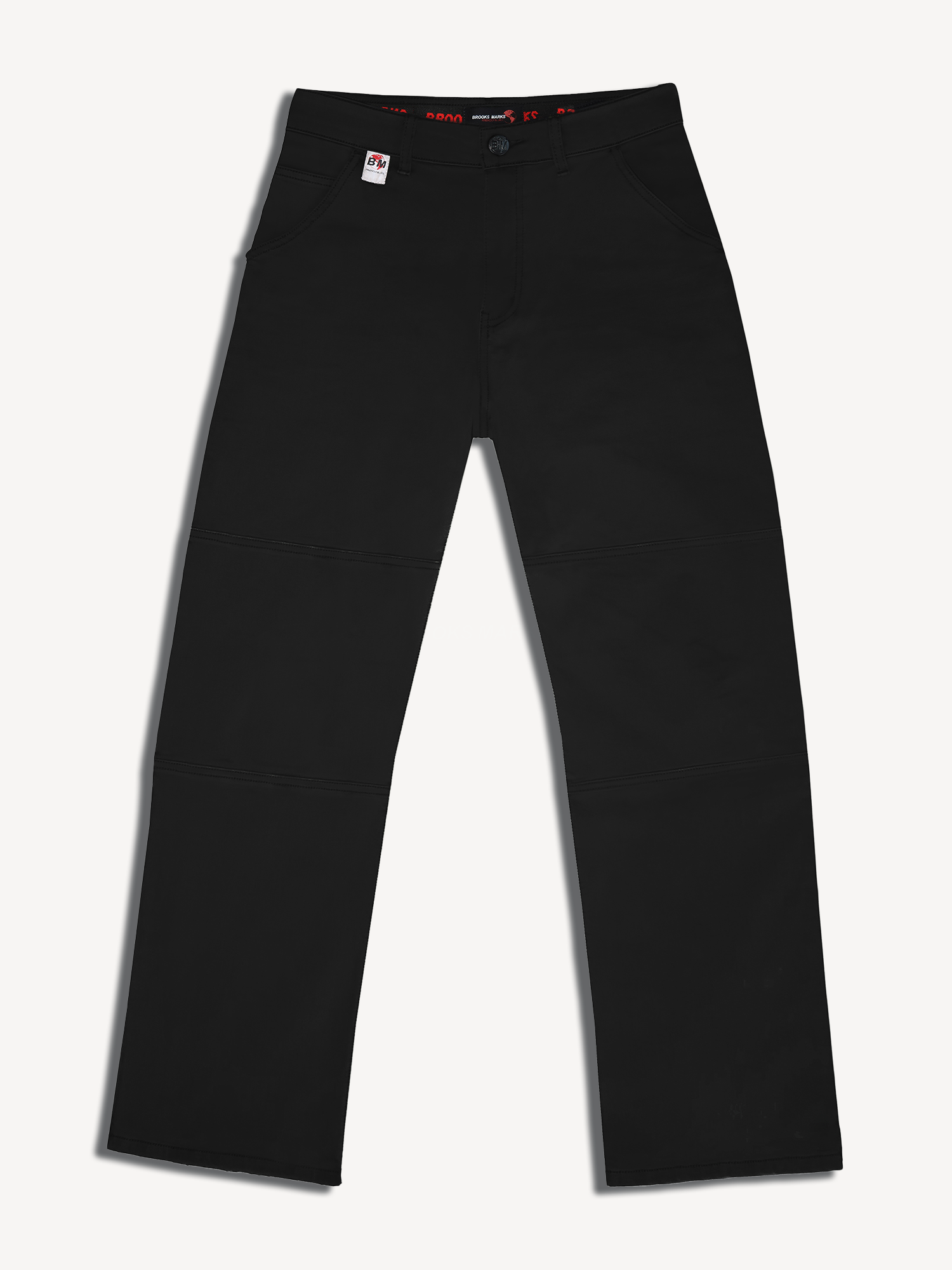 1 pair of the Brooks Marks x Friendly Blues Universal Panel Pants in shade jet black, featuring two side pockets, a panel over the knee, a leather waistband patch, elastic waistband, custom branded button and zipper closure, and two sewn-shut back pockets.
